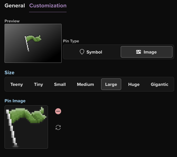 Auf der Registerkarte „Anpassung“ im Menü „Markierungseinstellungen“ findest du verschiedene Einstellungen, mit denen du das Aussehen deiner Kartenmarkierungen (in von dir erstellten Spielen) personalisieren kannst. Oben im Modalfenster zeigt eine dynamische Vorschau die ausgewählten Anpassungen; mit einem Klick kannst du sie rückgängig machen oder speichern.