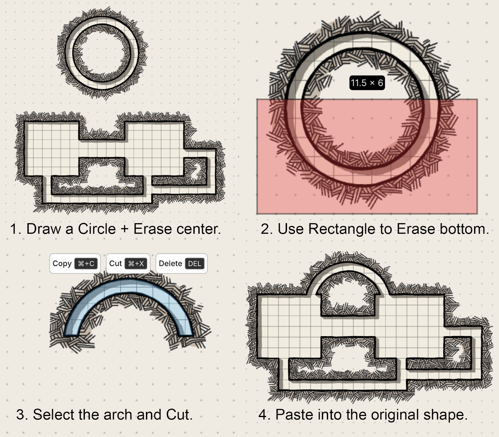 Build a complex shape by constructing it outside the dungeon or on a separate layer, then cut and paste it into position. This is useful when adding a shape directly would require erasing work you have already done.