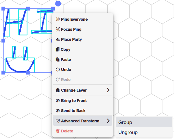 You can also group things together by selecting them, then right-clicking and choosing “Group” from the Advanced Menu. Grouping things lets you keep them in sync so you always move them at the same time.