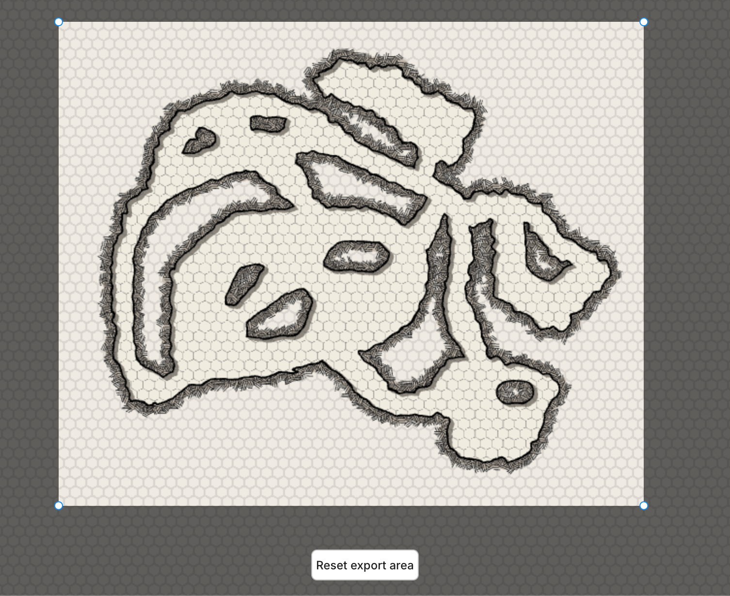 When the Export panel is open, a blue overlay appears on the canvas showing the area that will be exported. By default, the export area frames your entire map.