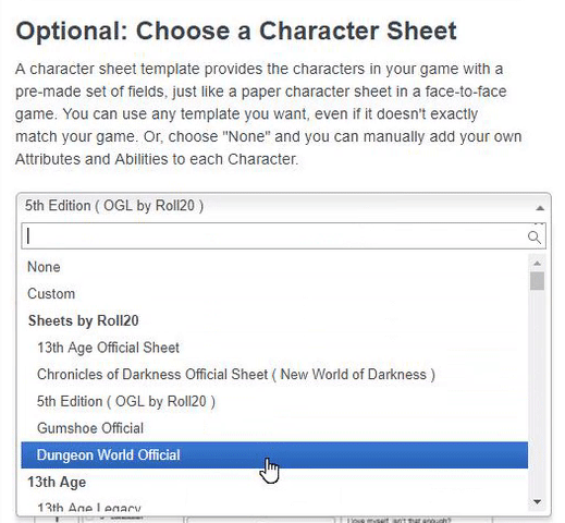 Se puede agregar una hoja de personaje oficial o contribuida por la comunidad a cualquier juego cuando lo creas por primera vez. En la pantalla de creación de juegos, debajo del gran botón azul “Estoy listo, crear juego!” se encuentra la sección “Opcional: Elija una hoja de personaje”. Aquí se encuentra un menú desplegable que muestra todas las hojas de personaje construidas tanto por Roll20 oficialmente como creadas por la comunidad. Estas hojas se ordenan bajo sus respectivos Sistemas de Juego de Rol en orden alfanumérico. Una vez seleccionada, una vista previa de la hoja de personaje se cargará en la página de creación para que la revises y también muestre información relevante sobre la hoja, como el creador de la hoja y sus características principales.