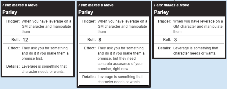 Puedes seleccionar o deseleccionar la casilla junto a "Roll" si un movimiento requiere un lanzamiento de dados, y especificar qué estadística utilizar (o PREGUNTAR, como en el caso de Desafiar el Peligro, que te presentará una consulta que pregunta qué estadística usar cada vez que lanzas el movimiento), y describir qué ocurre en caso de Éxito, Éxito parcial o Fallo (si corresponde). Se pueden incluir más detalles en el área de texto libre al final de cada movimiento. Puedes colapsar el movimiento utilizando el cuadro "-" en la parte superior derecha de cada entrada.