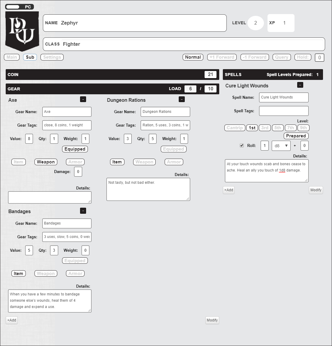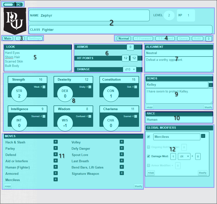La Página Principal está seleccionada por defecto y tiene la mayoría de la información que querrás usar regularmente para jugar a tu personaje. Esto debería parecer bastante familiar ya que está estilizado directamente después de los Playbooks para Dungeon World.