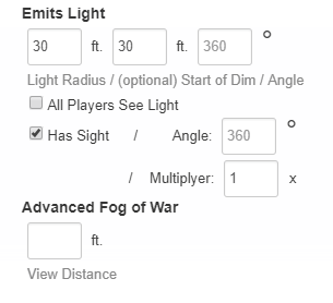 Nota: Si tienes una distancia de visión establecida en la sección de niebla de guerra avanzada de la Configuración avanzada de Token, las configuraciones de Emitir luces para ese token se ignoran por completo sin importar si tienes Revelar luz tenue habilitado o no en la Configuración de página.