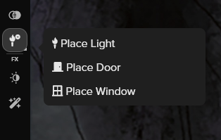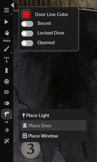 Dans le menu de la barre d’outils, veuillez cliquer sur l'icône en forme de torche pour afficher les options de vos composants (éclairage, fenêtre, porte). Cliquez sur le composant souhaité pour afficher les options de personnalisation du composant. À partir de ce moment, chaque fois que vous cliquez sur votre carte, votre composant sera placé. Veillez à ne pas laisser des portes aléatoires dispersées dans votre donjon !