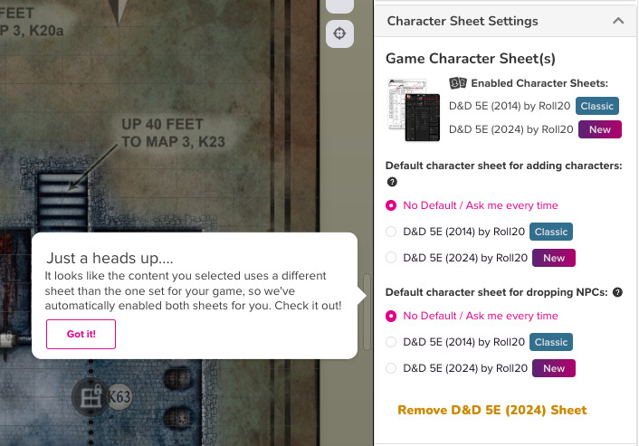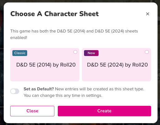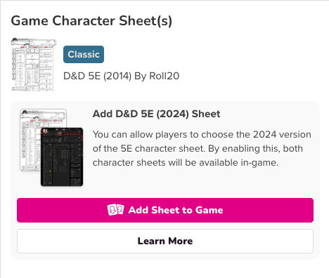 Vous pouvez avoir à la fois les anciennes feuilles D&D 5E (2014) et les nouvelles feuilles D&D 5E (2024) dans une même campagne. Il n'est disponible que dans Jumpgate, le jeu de table amélioré de Roll20.