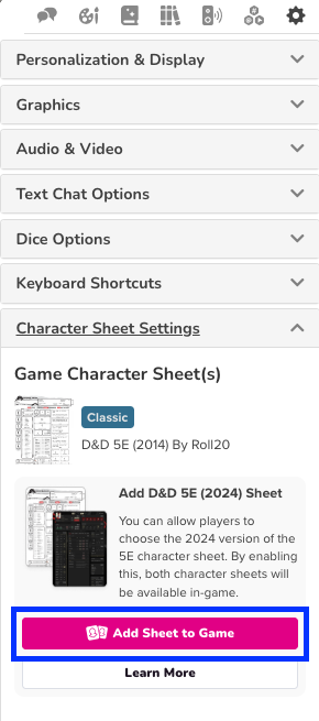 En tant que MJ, assurez-vous que vous êtes dans une partie Jumpgate, puis accédez aux paramètres de la feuille de personnage via les paramètres du jeu dans le VTT. Choisissez "Ajouter une feuille au jeu". Dans l'exemple ci-dessous, le jeu a été créé avec l'ancienne feuille de personnage D&D 5E (2014), qui sera la feuille principale du jeu. Vous allez ajouter la feuille D&D 5E (2024) à votre jeu.