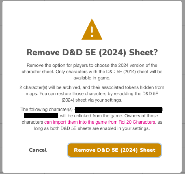 - Noms des personnages qui seront dissociés du jeu. Les propriétaires de ces personnages peuvent les importer dans le jeu à partir de Roll20 Characters à tout moment, à condition que les deux feuilles D&D 5E soient activées dans les paramètres du jeu. Ainsi, nous voulions nous assurer que les personnages des joueurs qui se trouvaient également dans les personnages Roll20 des joueurs avaient la possibilité d'être édités dans Roll20 Character et facilement introduits dans d'autres jeux, même s'ils n'étaient pas liés au jeu d'origine.