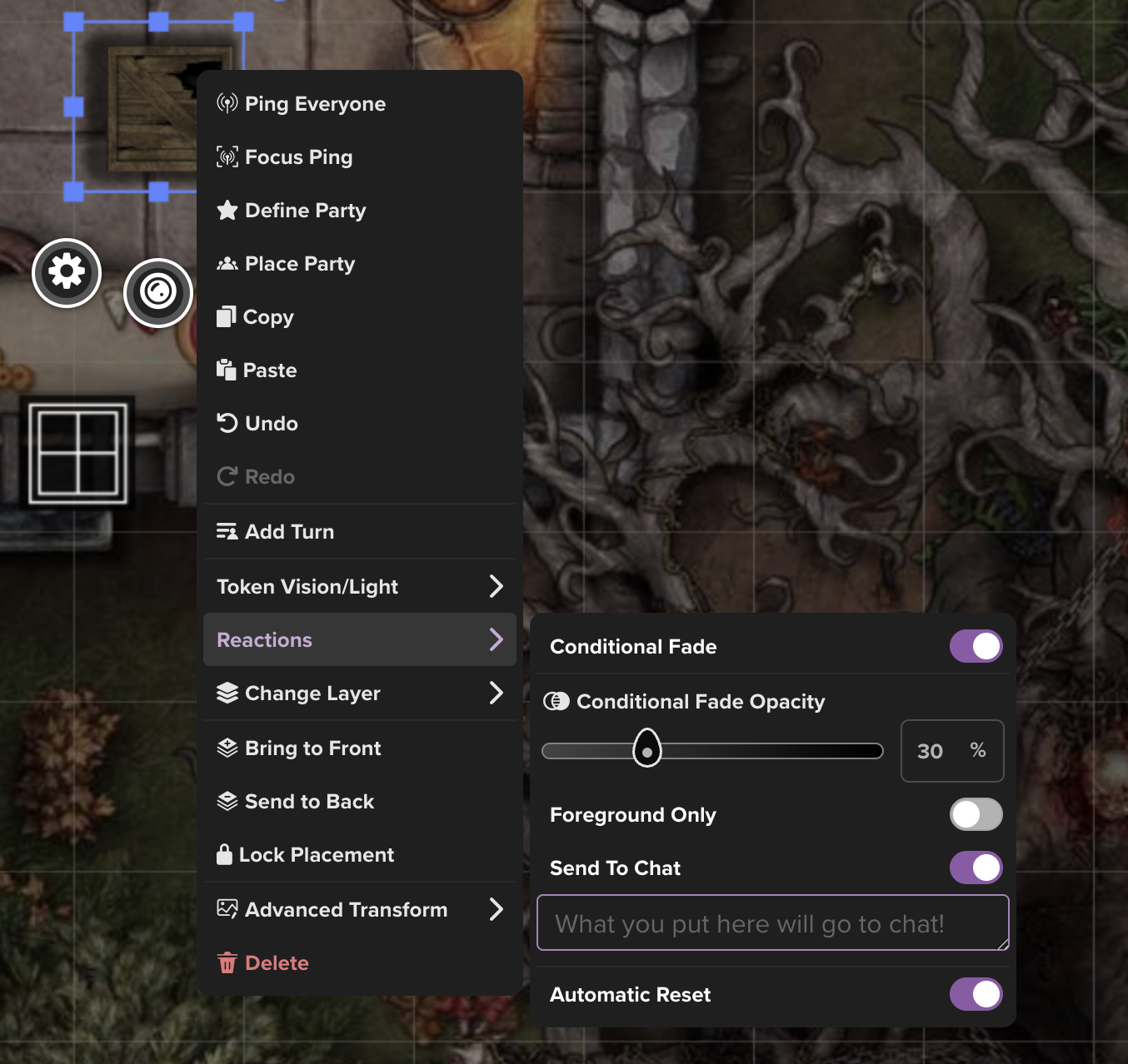La première réaction disponible est « Conditional Fade » (Dissipation conditionnelle). En activant cette option, vous pouvez définir un pourcentage d'opacité qui sera déclenché lorsque le jeton sélectionné* sera recouvert par un jeton contrôlé par un joueur ou par le MJ. Il peut être utilisé pour faire disparaître ou apparaître des éléments (lorsqu'il est associé aux paramètres d'opacité de base d'un jeton).