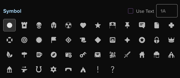 Les repères de carte standard sont considérés comme des repères « symboliques » et sont à la disposition de tous les MJ. Les épingles d'image sont disponibles pour les abonnés Pro et Elite et permettent d'utiliser des images personnalisées à la place de l'épingle symbole. (Pour plus d'informations à ce sujet, veuillez vous référer à la Section Images personnalisées ci-dessous.)