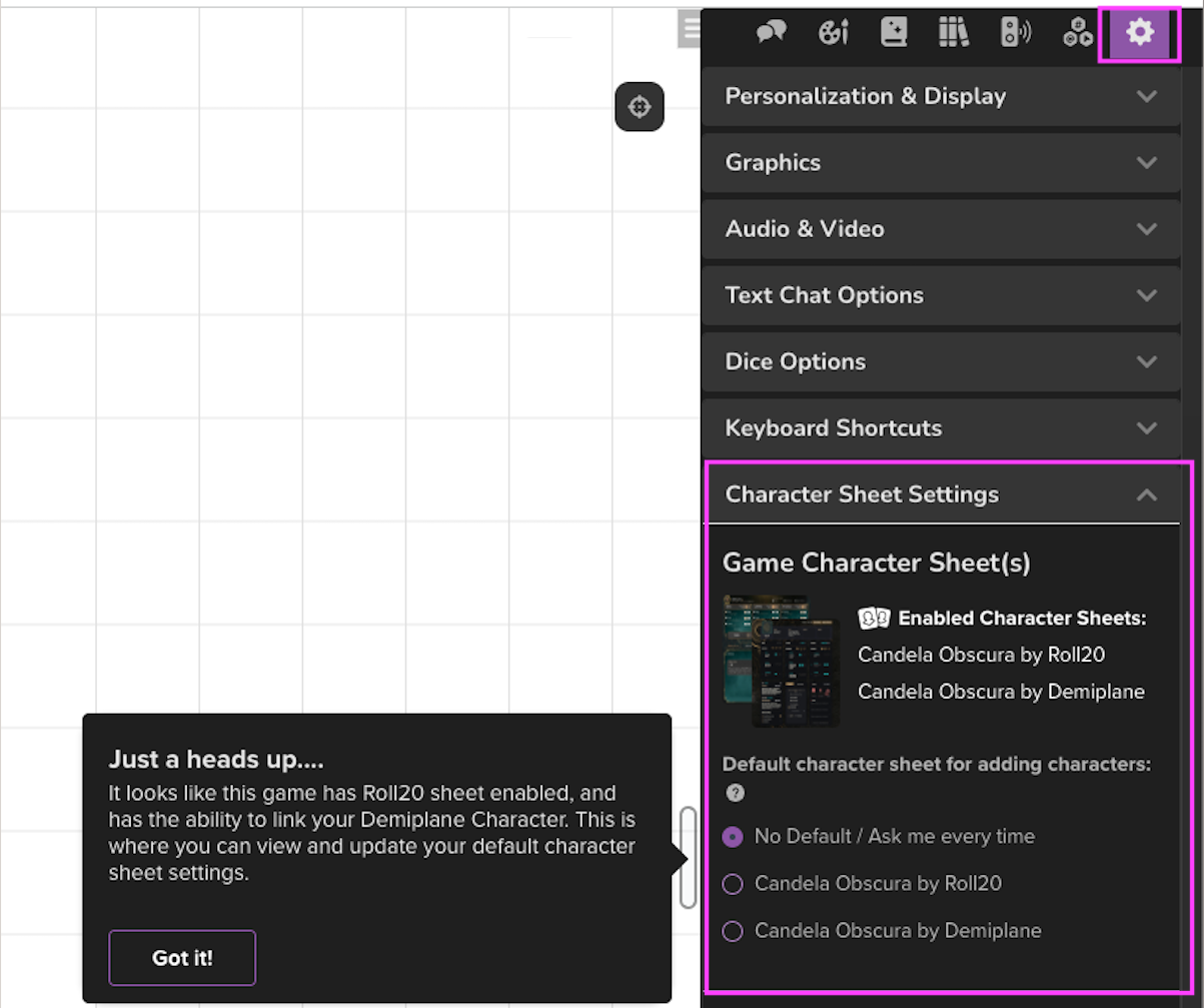 Ora è possibile collegare i suoi account Demiplane e Roll20 per giocare e utilizzare i suoi personaggi direttamente all'interno di Roll20.