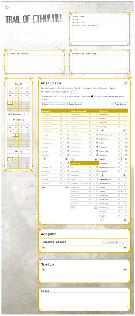 The tracker for Sanity (only visible on the Trail of Cthulhu sheet) works slightly differently. The grayed boxes will indicate your maximum Sanity, which normally aligns with your Sanity ability rating, much like how the Health and Stability trackers work. Once you gain any points in the Cthulhu Mythos ability; your maximum Sanity rating will decrease via the formula: 10 - your Cthulhu Mythos ability rating. For example, if you have 12 points in Sanity, and then acquire 1 point in Cthulhu Mythos, the tracker will indicate that your maximum Sanity should be 9, even though your Sanity ability rating still says 12. The tracker will auto-calculate the change to the sanity maximum as you add additional Cthulhu Mythos points.