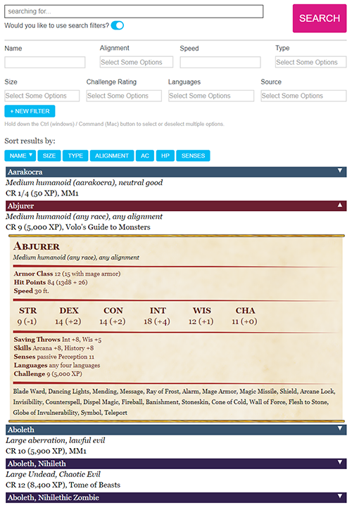 La lista dei mostri del Compendio 5E ha filtri di ricerca per il nome del mostro, l'allineamento, la velocità, il tipo e altro ancora. Allo stesso modo, la lista degli incantesimi nello stesso Compendio ha filtri di ricerca per dettagli specifici come il nome dell'incantesimo, il livello, la classe, la scuola, ecc.