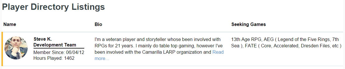 Quando esamina gli elenchi dell'elenco dei giocatori di, troverà le informazioni sul nome, la biografia e la ricerca di partite associate a ciascun giocatore. Per saperne di più su un giocatore, clicca sul linkLeggi di più… per visualizzare il suo profilo. Qui puoi inviare Messaggi Privati ai giocatori che desideri invitare.
