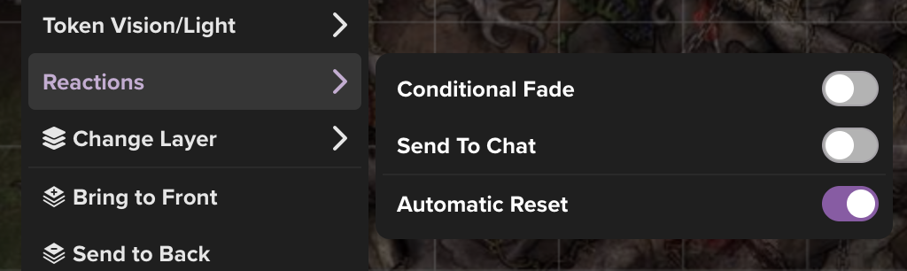 自動リセットがオフの場合、リアクションは一度だけ発動し、GMが手動でリセットするまで再発動しません。 (例えば、プレイヤーのコマが木箱の蓋と重なると蓋が開いたことを表現するために蓋が消えたり、隠されたメッセージが一度だけ表示されたりする。)