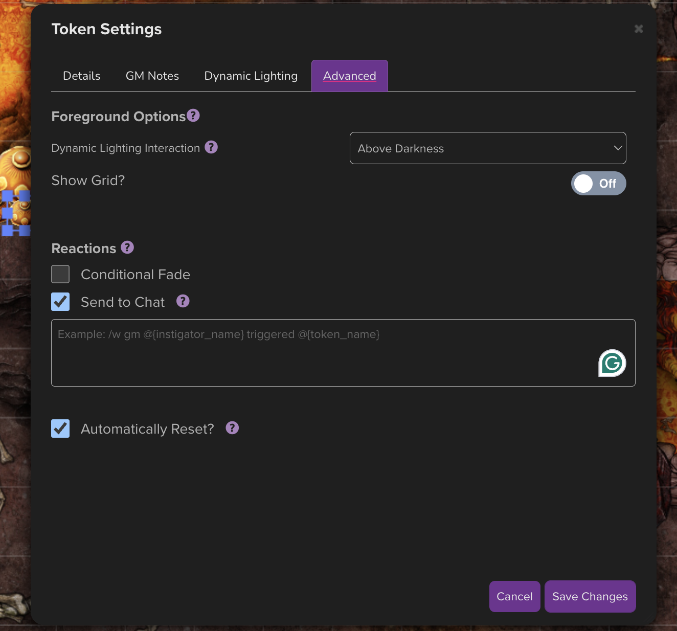 自動リセットは、特定のコマに設定されたすべての反応に適用されます。 オンに設定されている場合(トークン固有)、リアクションは発動後に自動的にリセットされ、GMまたはプレイヤー操作のトークンがリアクション・トークンと重なった際に再発動可能となります。 (例えば、溶岩の穴のように、コマがそのスペースに入るたびにトラップが発動するようにしたい場合など)