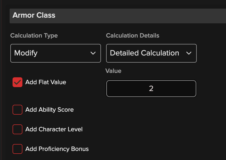 例: アーマークラスに+2を追加するフィーチャーを付与します 。 ベースのACが15(メタルスキンによる)の場合、このボーナスが積み重なり、ACが17になります。