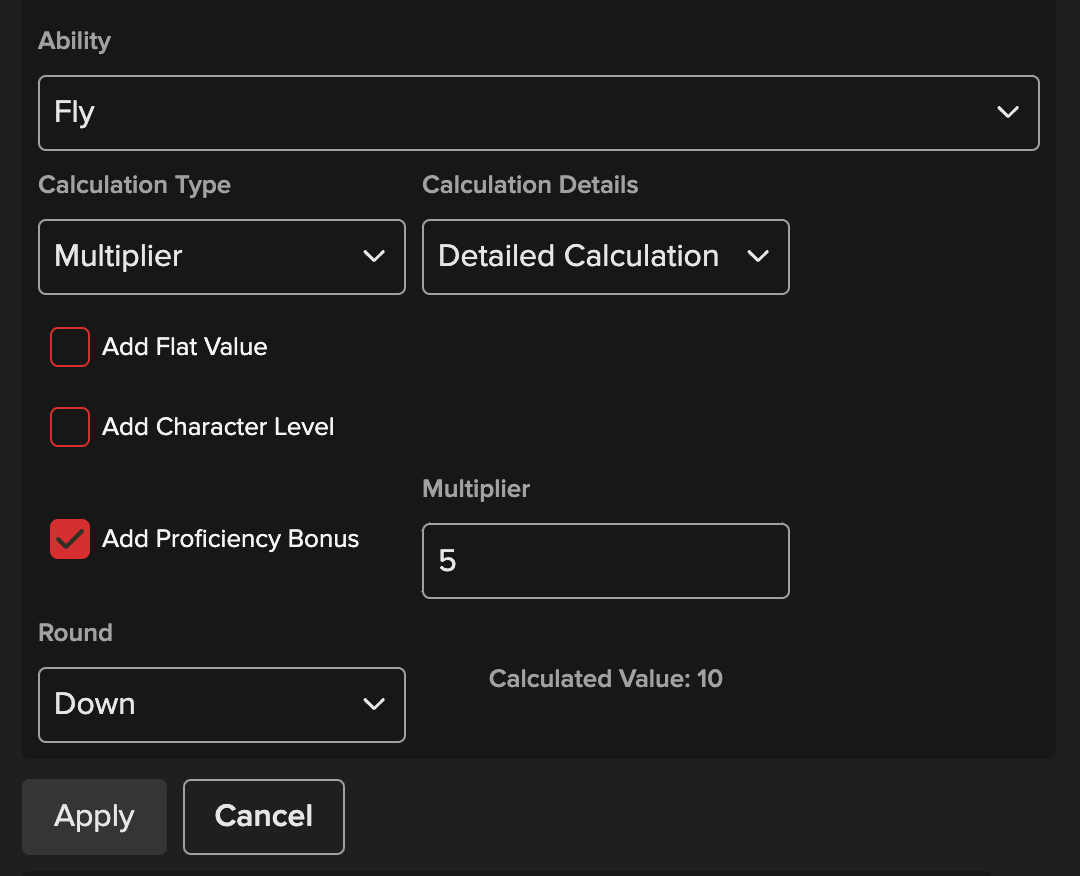 例:機能を追加すると 、次のような効果が付与されます:「飛行速度 = あなたの熟練ボーナス × 5。」 レベル5(プロフェッショナルボーナス = +3)では、飛行速度が15フィート増加します。 マルチプライヤーは、他のボーナスが合計された後に適用されます(設定値がそれを上書きする場合を除く)。