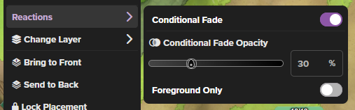 リアクションにより、トークンやアートアセット間の独自の相互作用を設定し、ユニークな動作を実現できます。 これにより、別のコマが接触した際に、コマがわずかにフェードする設定が可能です。 さらに、この動作を、アセットまたはトークンがフォアグラウンドレイヤーにある場合にのみ有効になるよう制限できます。