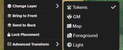 「レイヤー変更」オプション を使用すると、トークンやアセットを卓上の別のレイヤーに素早く移動させることができます。 GM レイヤー(プレイヤーには非表示)からコマレイヤー(プレイヤーには表示)へ、移動させたいサプライズエンカウントに最適です。