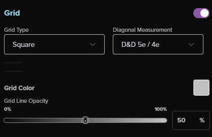 グリッドのサイズ、対角距離の測定方法、グリッドのタイプ(正方形、水平ヘクス、垂直ヘクス)、(D&D 5e/4e、3.5/パスファインダー、ユークリッド、マンハッタン、ヘクスグリッド)、セルにラベルを表示するかどうか(ヘクスグリッドのみ)、グリッドの色と不透明度など、さまざまなグリッドオプションから選択できます。 定規と寸法について詳しくはこちら.
