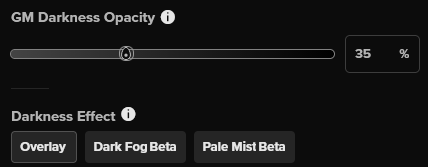 GM目線の透明度により、GMとして動的照明のマスクの透明度を変更できます。 これを下げるとマップをより鮮明に見ることができ、上げることでプレイヤーの100%不透明な視点をより忠実に再現できます。