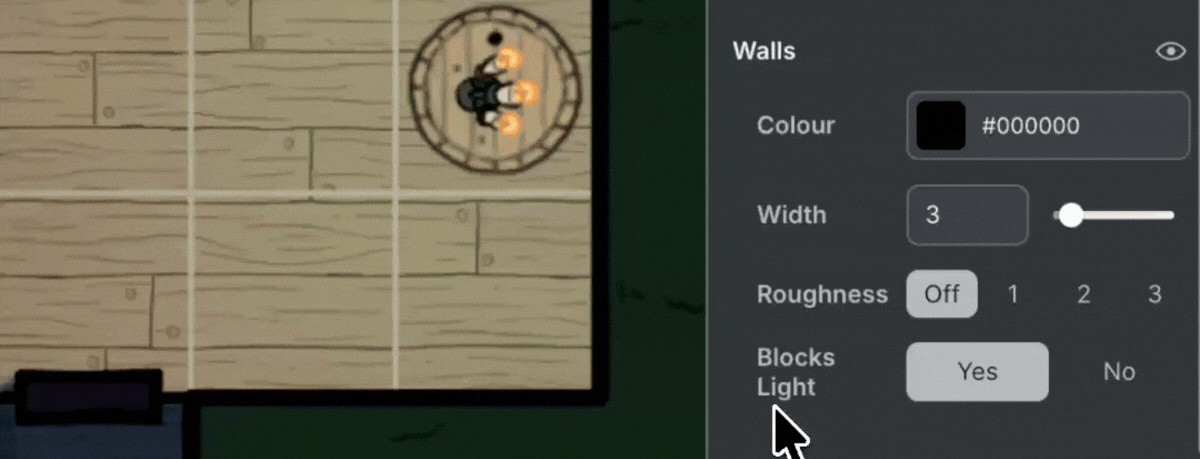 各ダンジョンのレイヤーでは、壁から光を遮断するように設定できます。 この設定を切り替えるには、「レイヤー」メニューで該当するレイヤーを選択し、「レイヤー設定」パネルにある「光を遮る」オプションを探してください。