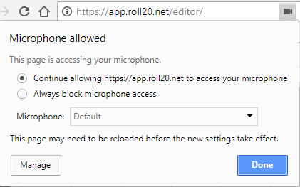 현재 Roll20은 VTT를 위해 Firefox와 Chrome 웹 브라우저만 완전히 지원합니다. 다른 브라우저들은 WebRTC를 거의 또는 전혀 문제없이 처리할 수 있을 수도 있지만, 문제가 발생할 경우 신뢰할 수 있는 기술 지원을 제공할 수 없습니다.