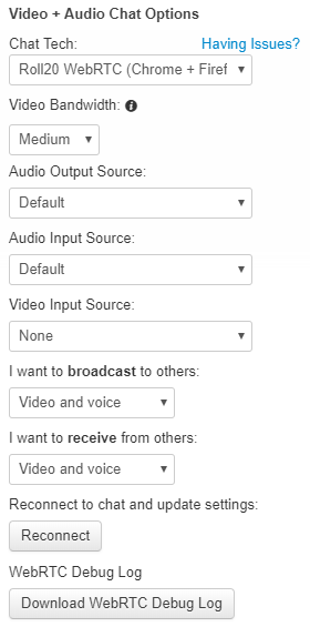 Roll20 WebRTC는 웹 브라우저에서만 사용할 수 있습니다. Roll20의 공식 지원 브라우저인 Chrome과 Firefox는 모두 호환됩니다. Roll20 WebRTC 통화는 채팅당 추가 사용자 당 512Kbps의 다운로드 및 업로드 대역폭을 권장합니다. 이는 여섯 명의 통화에서(자신을 제외한 다른 다섯 명의 사용자) 안정적인 통화를 위해 약 2.5Mbps의 대역폭이 필요함을 의미합니다. 그룹의 연결이 이러한 요구 사항을 충족시킬 수 없는 회원이 있다면 하드웨어 가속 및 데이터 압축을 활용할 수 있는 3rd 파티, 브라우저 기반이 아닌 채팅 옵션을 사용하는 것을 권장합니다.