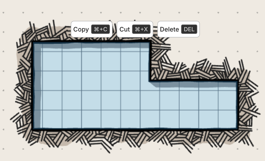 복잡한 모양은 던전 밖이나 별도의 레이어에서 먼저 만든 다음, 잘라내어 원하는 위치에 붙여넣으세요. 이미 작업한 부분을 지워야만 도형을 직접 추가할 수 있는 경우에 유용합니다.