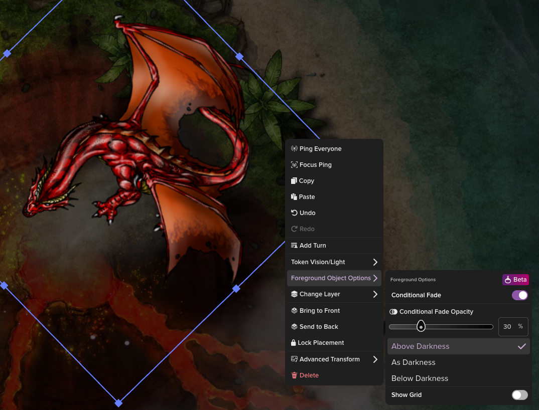 - Show Grid: Enables GMs to designate if a grid line should show above a foreground layer object, and currently available on square grids. This per-object setting helps ensure large foreground layer objects don’t obfuscate players’ ability to eye distances or spoil surprises