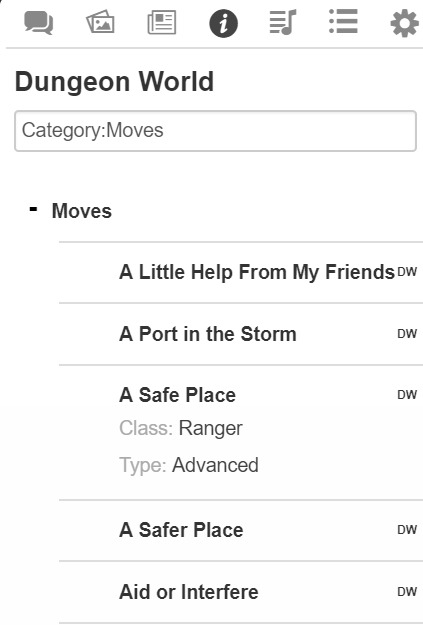 던전 월드 공식 캐릭터 시트를 캠페인에 추가하면 던전 월드 컴펜디움 이 자동으로 활성화되어 애플리케이션의 사이드바 에서 자체 탭으로 사용할 수 있습니다. 저널과 주크박스 탭 사이에 위치하며 GM과 플레이어 모두에게 접근 가능합니다.