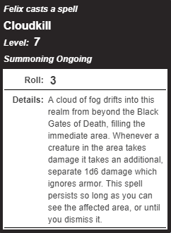 롤 옵션:롤 확인란을 클릭하면 롤 공식을 지시하는 필드(주사위 개수 필드, 주사위 종류 선택 필드 및 수정자 필드)가 활성화됩니다. 체크 박스를 선택하면 주문 롤 템플릿에 롤 결과가 포함됩니다. 이 체크 박스를 선택하지 않으면 주문 롤 템플릿으로 롤이 이루어지지 않지만, 템플릿은 채팅에서 여전히 작동합니다. 이는 파티의 편의를 위해 주문의 나머지 정보를 표시합니다.