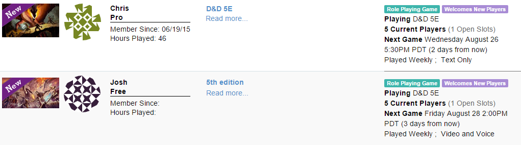 당신의 그룹 찾기 목록 에는 게임 이미지, GM에 대한 정보, 게임의 이름 & 와 설명, 그리고 게임과 일정에 대한 스냅샷을 제공하는 메타 데이터가 포함되어 있습니다.