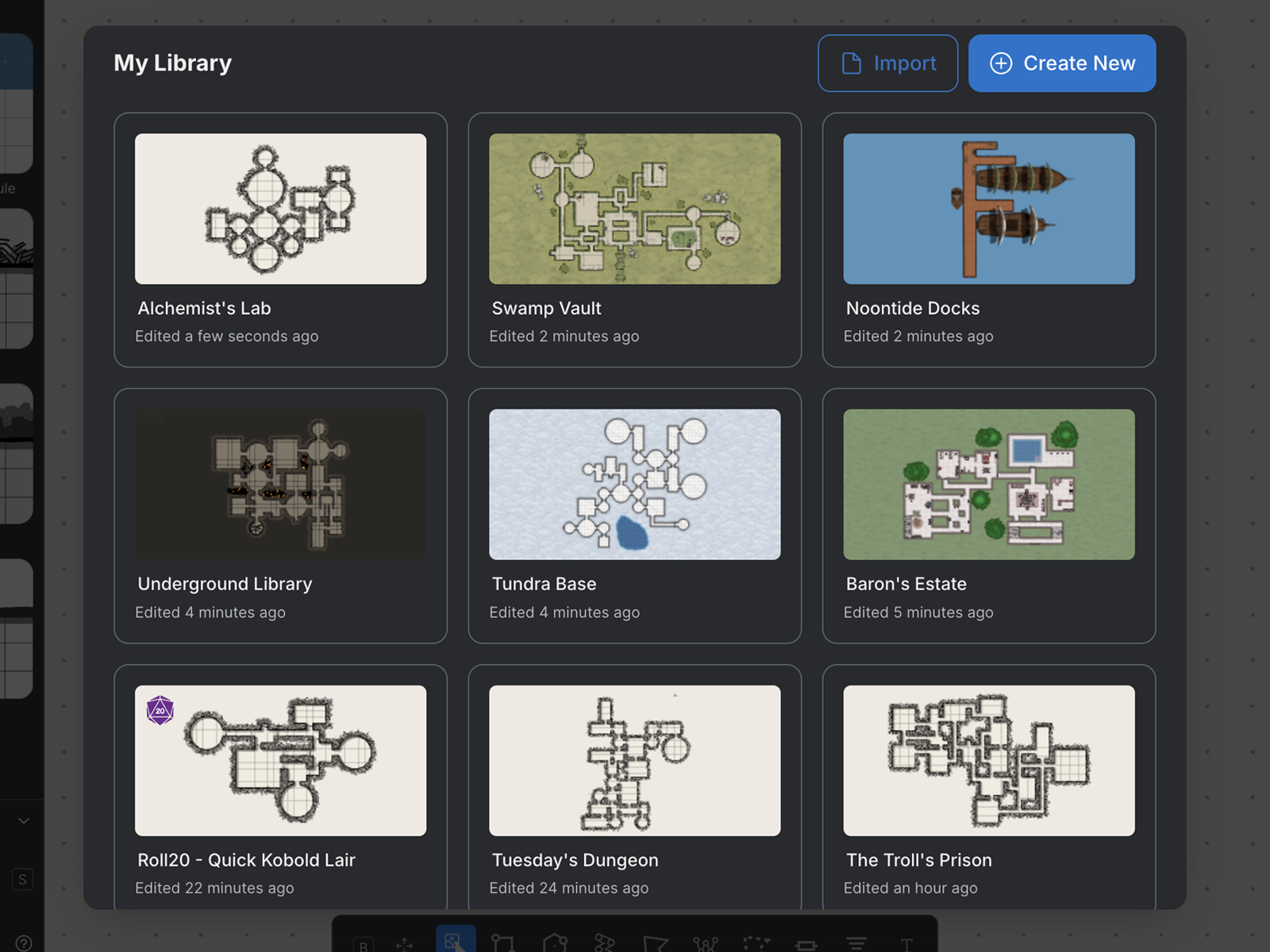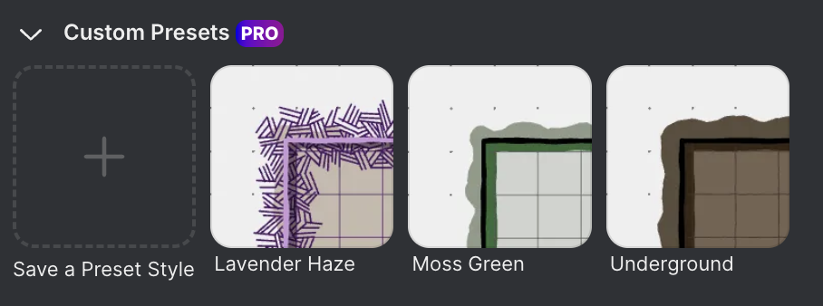 Guarde os seus próprios estilos de camada e reutilize-os em diferentes mapas e sessões. Crie uma biblioteca pessoal de estilos e aplique-os com um único clique, tal como acontece com as predefinições de masmorras integradas.