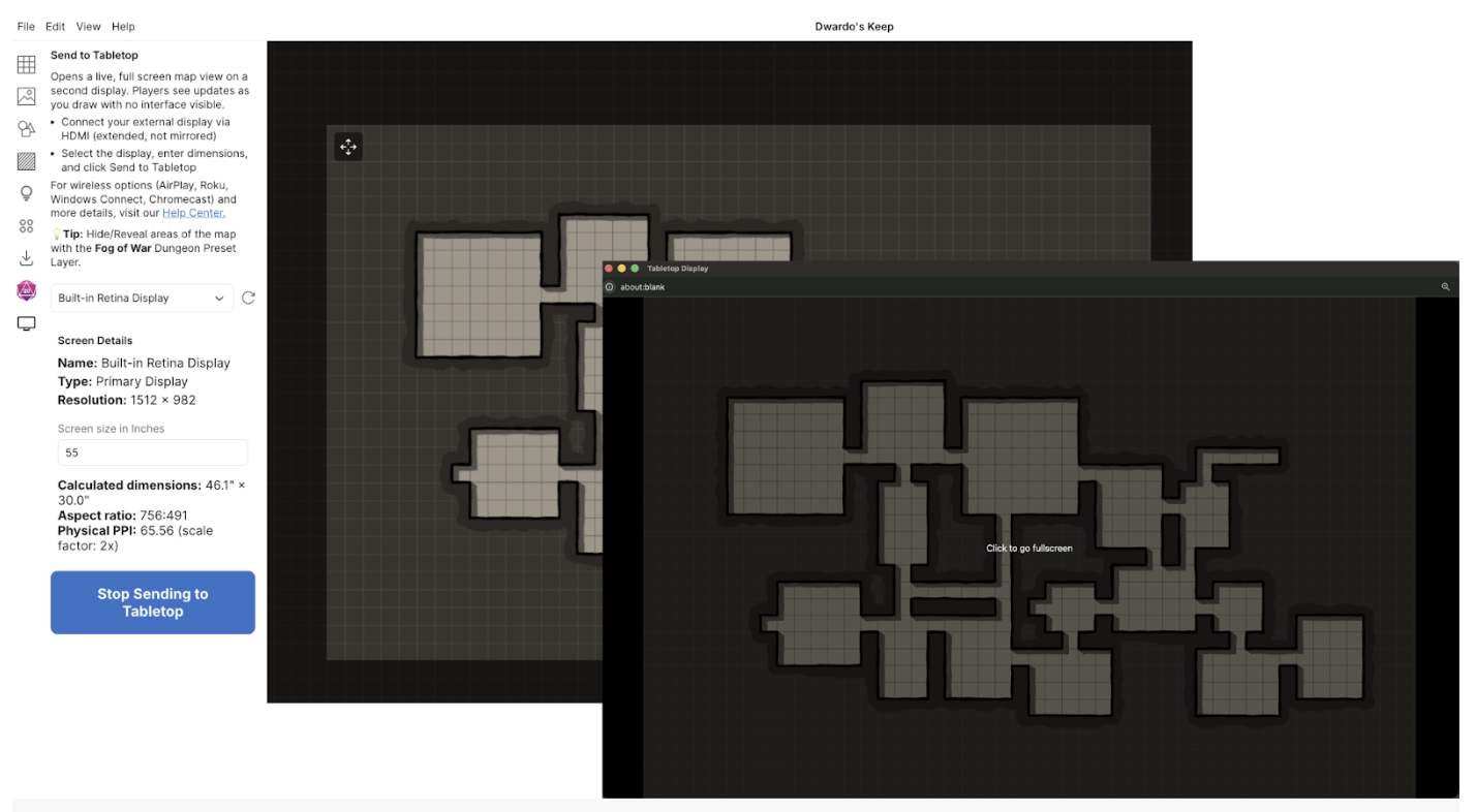 A função «Enviar para o Tabletop» abre uma visualização do mapa em tempo real e em ecrã inteiro num ecrã externo. Os jogadores vêem o mapa a atualizar-se em tempo real à medida que desenha, sem que seja visível qualquer interface. É uma excelente solução para jogar presencialmente utilizando um monitor, uma televisão ou um projetor.